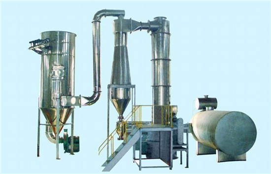旋转闪蒸干燥机采用高速热气流切线方向进入筒体,由于气流在筒内的螺旋运动,一方面降低颗粒周围的介质温度,同时增加了介质流速和温度,这就大大地提高了外扩散的速度。另一方面,高温气流高速冲击于筒体下部的颗粒或湿料,同时筒体内搅拌叶片的搅拌作用,使颗粒被破碎、粒度减小、内部毛细管的长度也因之减小,强化了内扩散的效果,降低内扩散的阻力。这些颗粒又大多在筒体下部高温、高搅拌强度的循环中被反复破碎。消除物料结块,也是促进内扩散的有力措施,强化了颗粒水分的蒸发。